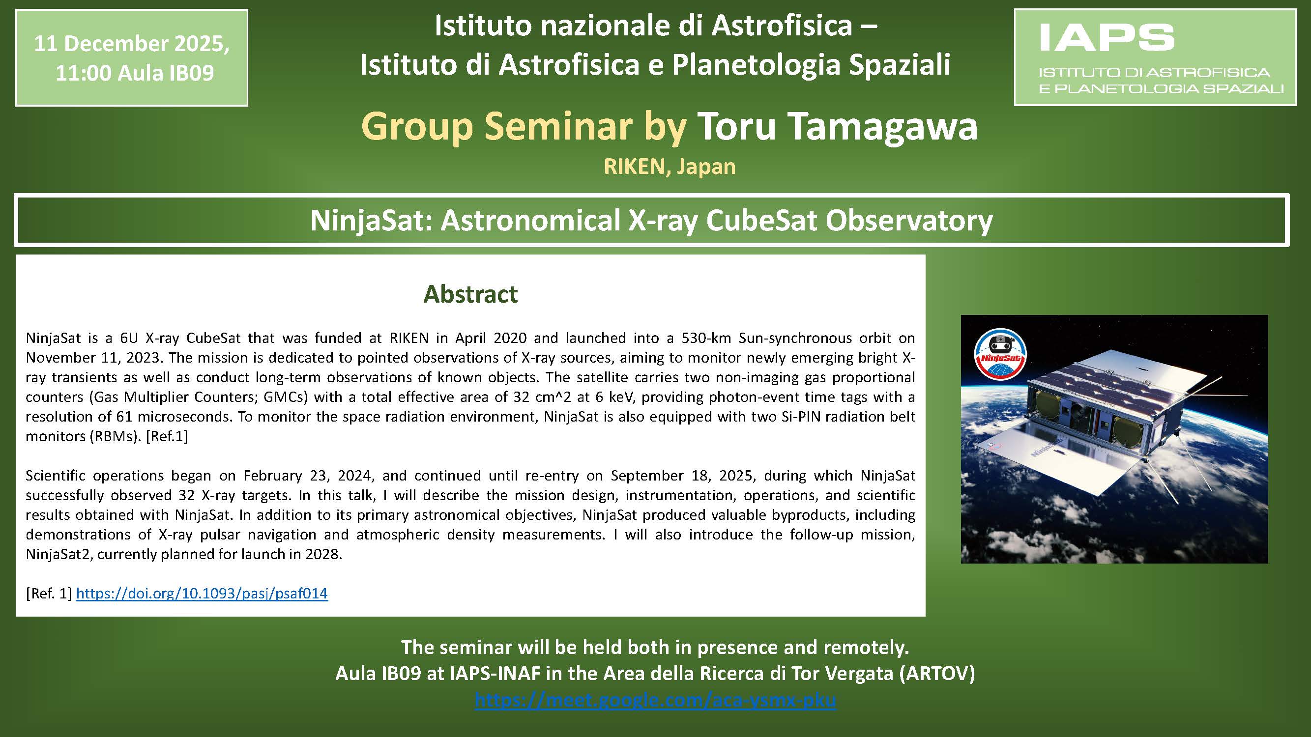 Scientific operations began on February 23, 2024, and continued until re-entry on September 18, 2025, during which NinjaSat successfully observed 32 X-ray targets. In this talk, I will describe the mission design, instrumentation, operations, and scientific results obtained with NinjaSat. In addition to its primary astronomical objectives, NinjaSat produced valuable byproducts, including demonstrations of X-ray pulsar navigation and atmospheric density measurements. I will also introduce the follow-up mission, NinjaSat2, currently planned for launch in 2028.
