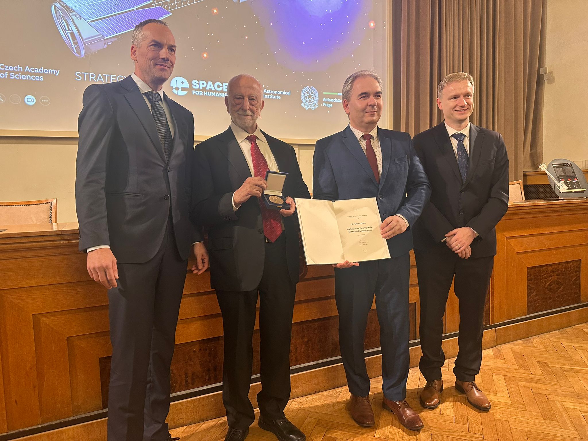 Ieri, 24 novembre 2025, presso la sede dell’Accademia delle scienze ceca, si è tenuta la cerimonia durante la quale Costa ha ricevuto la medaglia “Ernst Mach”. «Sono onorato per questo che intendo come un riconoscimento per la collaborazione presente ed un incoraggiamento per il futuro», commenta Costa dopo la premiazione. «Nell’ambito della proposta per l’Esa di una nuova missione di classe M8, stiamo ragionando sull’importante ruolo che potranno avere università e industrie della Repubblica Ceca, anche sulla strumentazione scientifica».